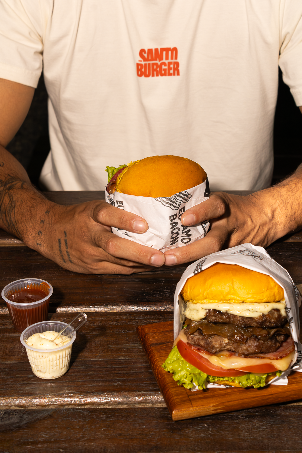 Fotografia profissional de hambúrguer artesanal para o Santo Burger, valorizando suculência, camadas e ingredientes frescos. Perfeito para estratégias de marketing digital, delivery e campanhas visuais de restaurantes.
