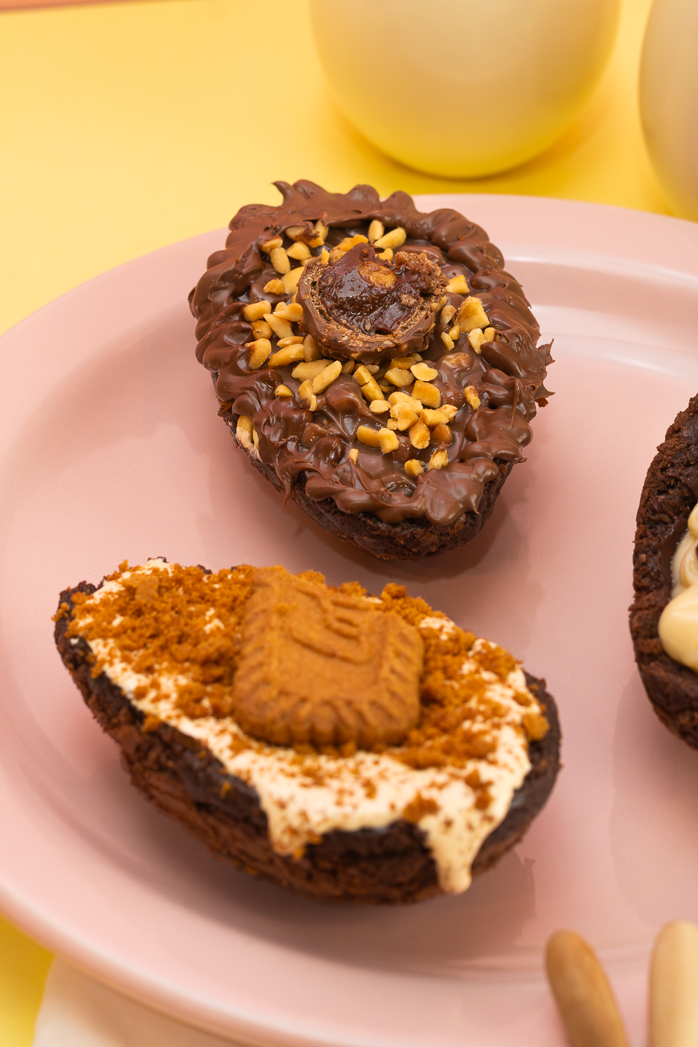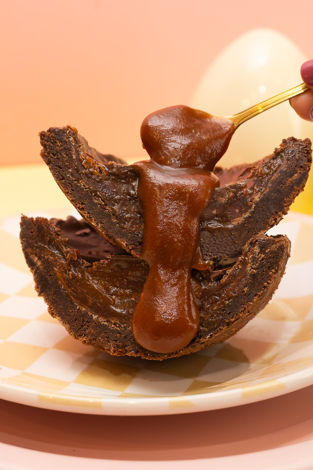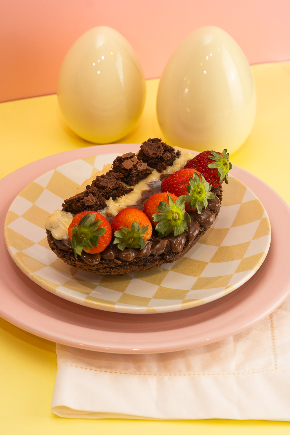 Ensaio temático de Páscoa com foco em brownie recheado e sobremesas especiais. A fotografia evidencia textura, cremosidade e apelo visual, ideal para campanhas sazonais e vendas comemorativas.