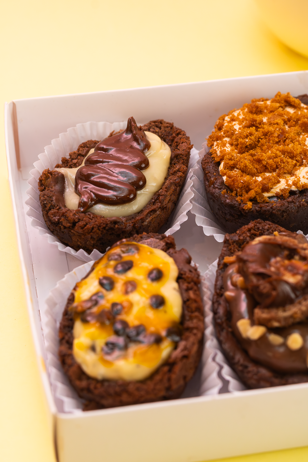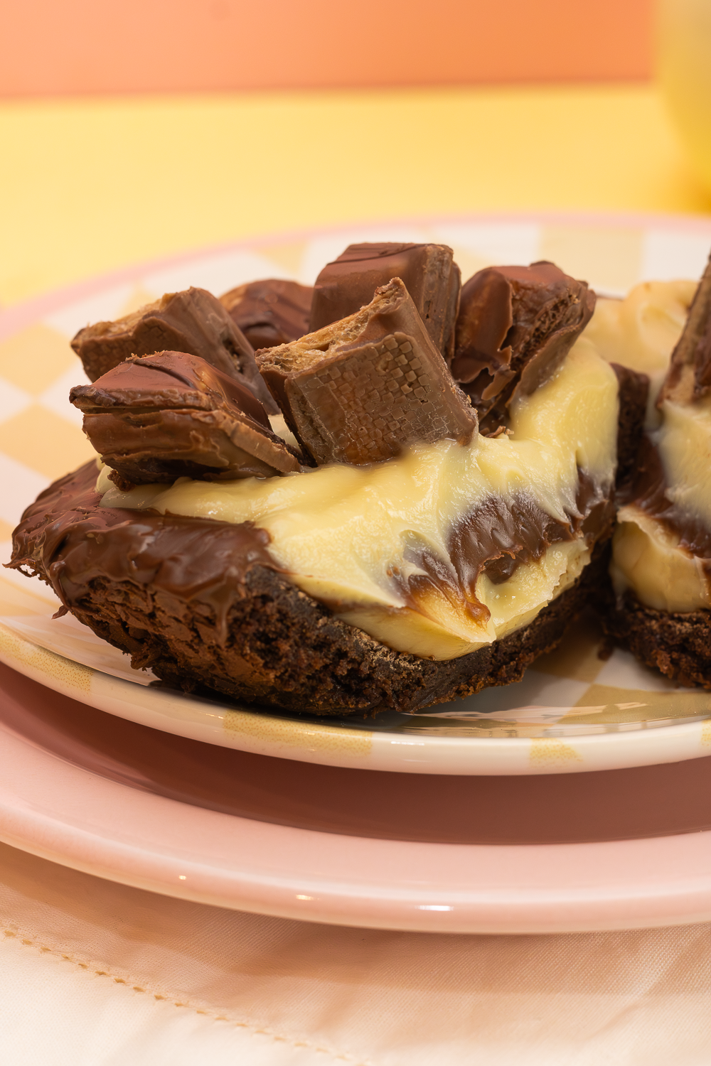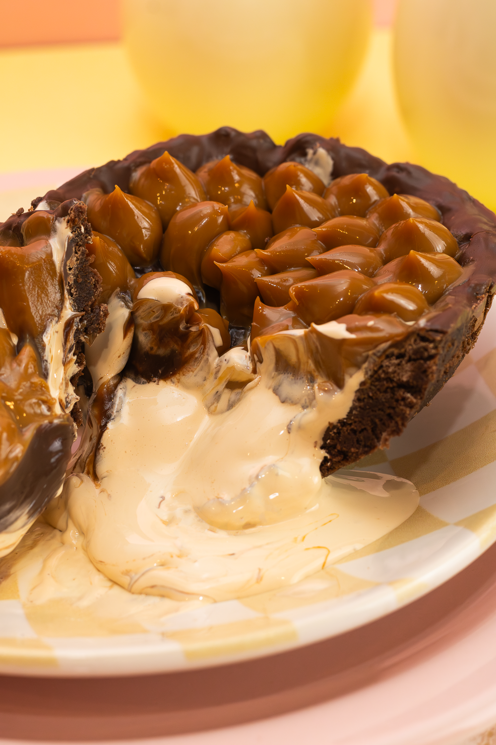 Ensaio temático de Páscoa com foco em brownie recheado e sobremesas especiais. A fotografia evidencia textura, cremosidade e apelo visual, ideal para campanhas sazonais e vendas comemorativas.